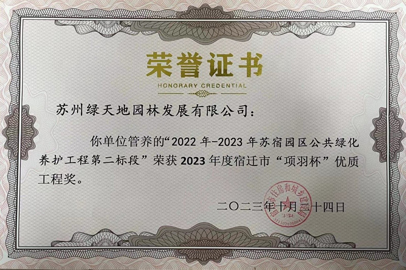 近日,由宿遷市蘇宿園區(qū)建設(shè)發(fā)展有限公司負(fù)責(zé)管理的蘇宿工業(yè)園區(qū)2022-2023年公共綠化養(yǎng)護(hù)工程第一、二標(biāo)段,同時(shí)榮獲2023年度宿遷市“項(xiàng)羽杯”優(yōu)質(zhì)工程獎(jiǎng)。