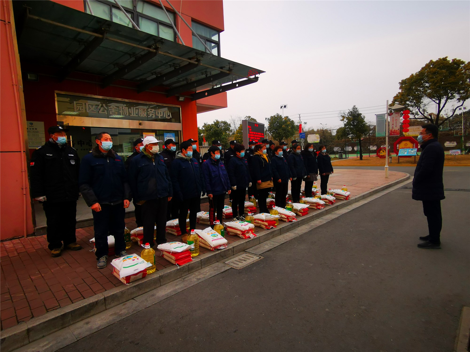 在新春佳節(jié)即將來臨之際,1月28日下午,公司副總經(jīng)理倪松慰問了奮戰(zhàn)在一線保潔及保安人員,為他們送上了米、面粉、油等慰問品。