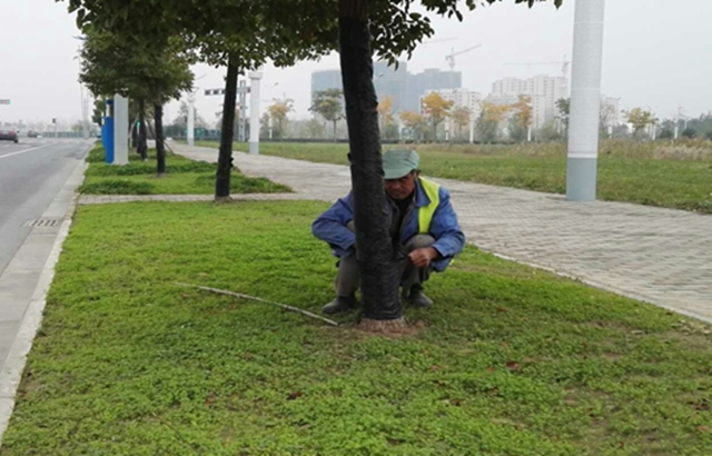 對(duì)于耐寒性差的常綠喬灌木如香樟等,進(jìn)行草繩、薄膜裹樹(shù)干防凍保護(hù)處理;對(duì)于落葉喬灌木,進(jìn)行樹(shù)干涂白處理,減小樹(shù)木晝夜溫差、防止樹(shù)木凍裂,并能起到殺菌、滅蟲(chóng)的功效。